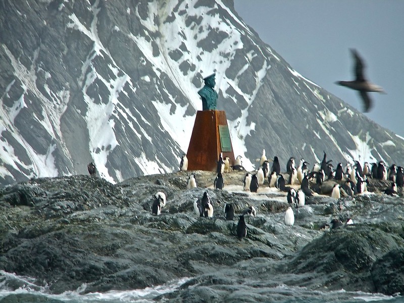 A bird flies past the Pardo Statue on Elephant Island, Antarctica