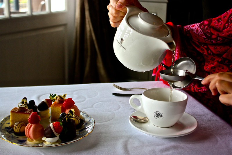 High tea takes place in 1885, not the year, but the restaurant. You're escorted into the well appointed dining room by one of the professional waiters, who'll pull out your chair and help you get settled. On your table, you'll find a silver spoon-like sifter that makes it easy to pour your tea without letting the tea leaves into your cup and a napkin with a buttonhole. Pinky up, anyone?