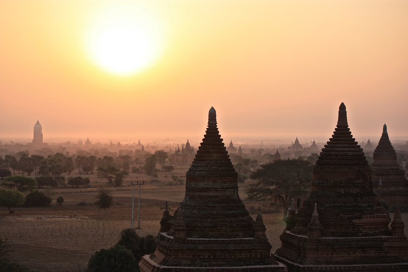 - Thousands of crumbling red brick stupas scattered across the desert in Bagan